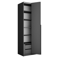Локер — вместительный шкаф со складной системой открывания, отличающийся своим удобством в эксплуатации и легкой установкой. Благодаря надежным полкодержателям - штифтам, полки шкафа могут выдерживать до 15 кг, штанга выдерживает до 60 кг. Шкаф оснащен долговечной, ударостойкой кромкой ПВХ, которая защищает его торцы от сколов и повреждений. Складная система дверей WingLine L экономит внешнее пространство за счет складывания дверей и обеспечивает их надежную фиксацию в открытом виде. Данный механизм обеспечивает плавный ход и исключает образование слепых зон. Система рассчитана на 40 000 циклов «открывание-закрывание». Для эффективной организации пространства внутри корпуса, двери оснащены минимальным выступом. Шкаф оснащен удобной минималистичной ручкой, изготовленной из алюминия.