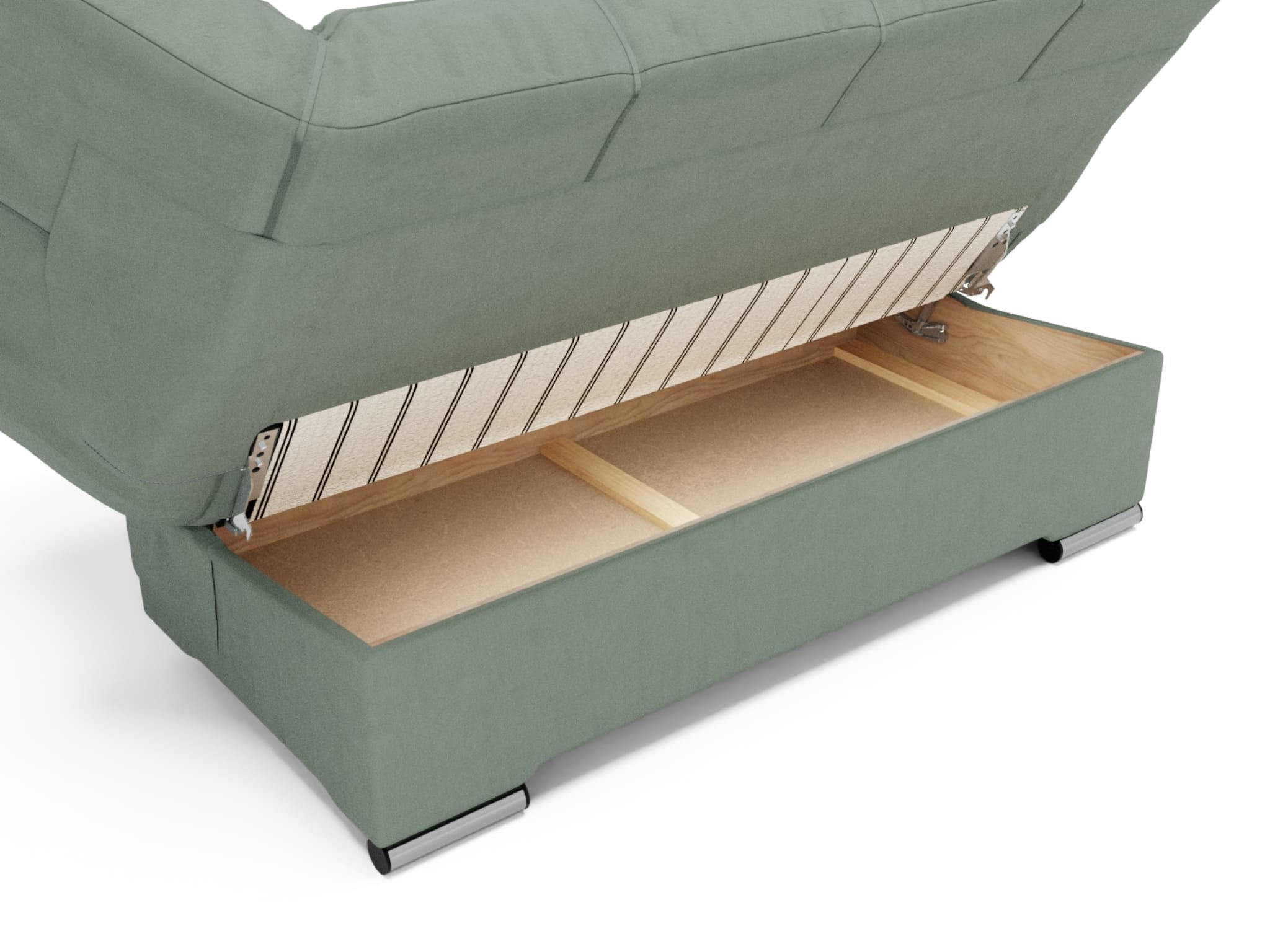 Размеры: длина -205-190см. высота - 100 см, ширина - 100 см. Обивка выполнена из текстиля, цвет фисташковый. Глубина сиденья - 65 см, длина спального места - 205 см. Глубина дивана - 100 см, максимальная нагрузка - 220 кг.